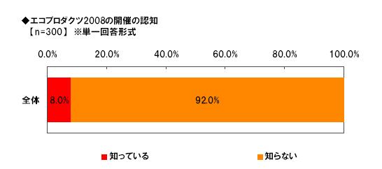 日本最大級の環境展示会「エコプロダクツ2008」の認知状況を聞いたところ、「知っている」と回答したのは全体の8.0%の24名でした。「知っている」と回答した24名に対し、認知経路を複数回答形式で聞いたところ、最も多かった回答は「インターネット」で、2位「新聞」、3位「テレビ」という結果になりました。