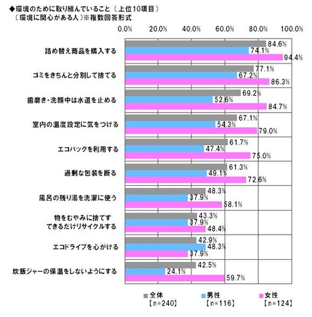 関心がある人(240名)に対し、環境のために取り組んでいることを複数回答形式で聞いたところ、1位「詰め替え商品を購入する」84.6%、「ゴミをきちんと分別して捨てる」77.1%、「歯磨き・洗顔中は水道を止める」69.2%となりました。また、男女別で見ると、「エコドライブを心がける」の項目以外で、女性が男性の割合を上回り、女性の方が環境のために様々なことに積極的に取り組んでいる様子がうかがえる結果となりました。