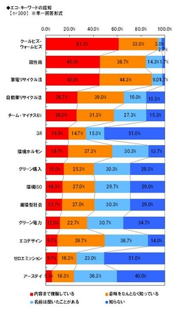 環境関連キーワードの認知状況について聞いたところ、「知っている」(「内容まで理解している」「意味をなんとなく知っている」)と回答の割合が最も多かったのは「クールビズ・ウォームビズ」で94.3%という結果になりました。次に認知率が高かったのは「家電リサイクル法」で89.3%、続いて「酸性雨」84.0%という結果となっています。逆に「アースデイ」23.7%、「ゼロエミッション」26%は認知率が低いという結果になりました。