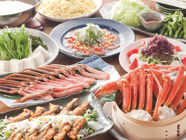 北海道大漁盛り、活たらば刺身、日高豚蒸ししゃぶ、北の黄金鶏味くらべ串盛り、海の恵30品目サラダ、北海道ポテトフライ、蟹入りちーずフォンデュ、