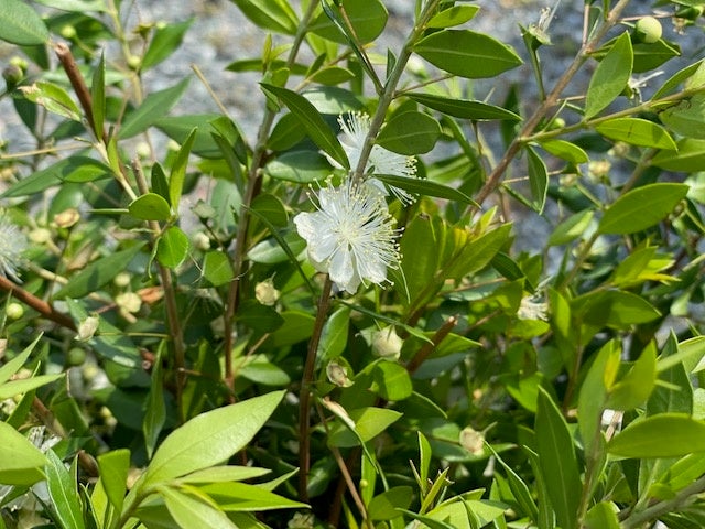 この度のイベントでは、ギンバイカをはじめとした樹木の魅力をご紹介します。ギンバイカ(銀梅花)は福岡県の緑化木推奨樹種のひとつです。「幸運の木」としても知られており、今秋にはエリザベス女王国葬棺のリースに小枝が使用されたことでも話題となりました。当日は蒸留デモンストレーションの他、ギンバイカを活用した苔玉・アロマスプレー制作のワークショップも行います。