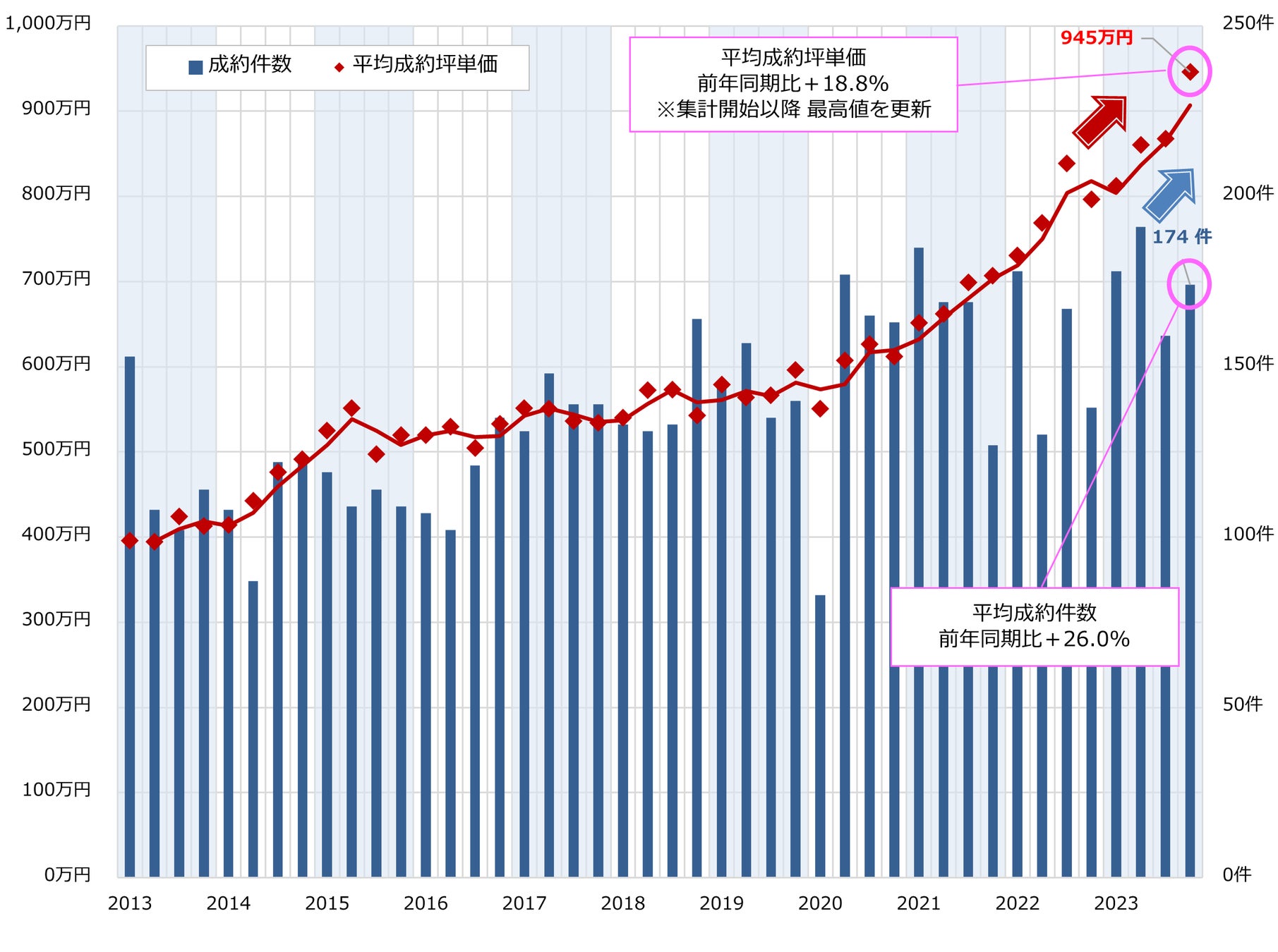 プレミアムマンション全体の推移を見ますと、今期の平均成約坪単価は前年同期比+18.8%の945万円となり、3期連続して集計開始以降の最高値を更新いたしました。平均成約価格は前年同期比24.5%の2億5,156万円となり、集計開始以降の最高値を更新しました。また、成約件数も前年同期比+26.0%の174件と増加し、前期の減少から増加に転じました。
