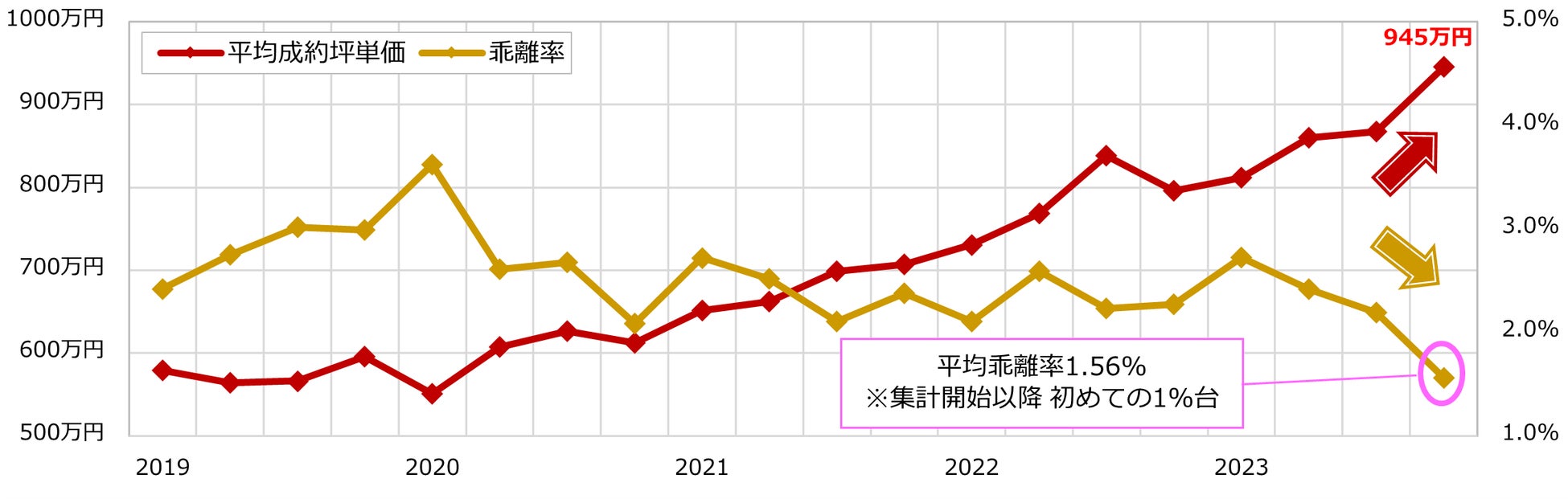 図3 プレミアムマンション全体の平均成約坪単価と平均乖離率の推移