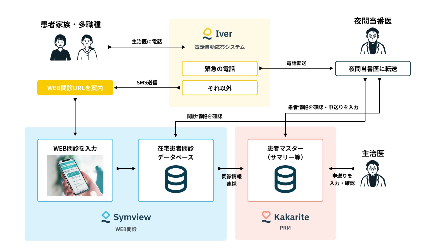 電話自動応答システムIver、WEB問診Symview、PRM Kakarite(患者情報共有ツール)を使うことで、訪問診療も含めて、患者を最期まで診ようとするかかりつけ医を支援します。