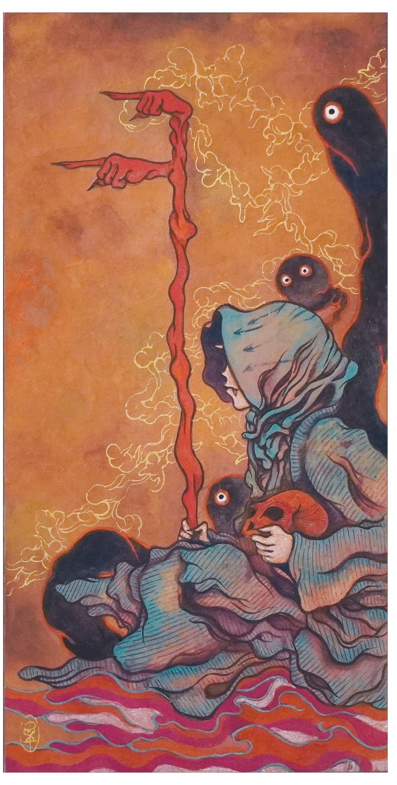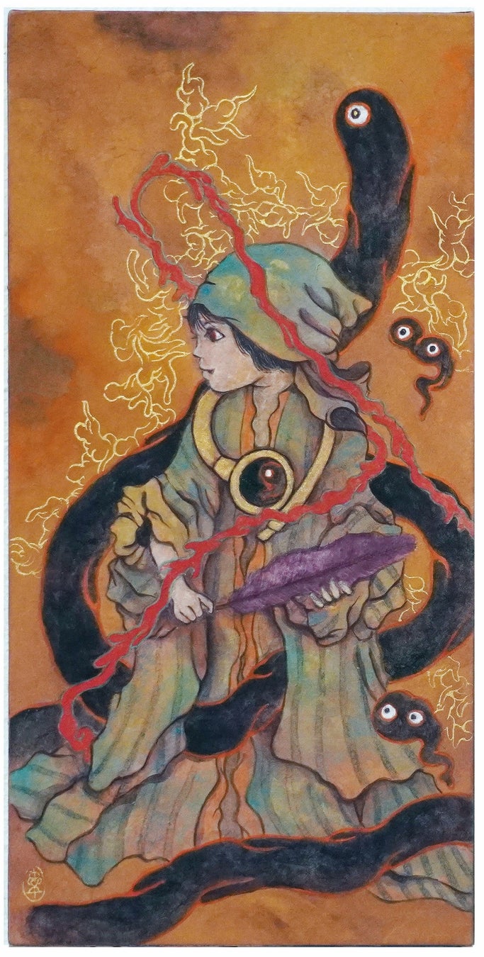 小豆島生まれの妖怪画家。1998宝塚造形芸術大学卒、叶匠寿庵にて和菓子の販促物パッケージのデザイン等に関わる。2005絵描鬼宣言。魑魅魍魎を生み出す妖怪製造裝置というものを中心に制作活動中。東京・高松・京都などで個展を開催するほか、台湾でも個展やアートブックフェアにも出展。人と対話しながらその内面を描画する「妖怪似顔絵」も人気。妖怪造形作品のコンテスト「妖怪造形大賞」の審査委員も勤め、2018年2月、小豆島を世界一妖怪の集まる島にすることを目的に誕生した「妖怪美術館」の館長に就任。2017個展「妖怪絵圖まつろわぬものたち」(六本木ストライプハウスギャラリー)個展「妖怪絵図展」(台湾田園城市ギャラリー)個展「妖怪製造装置」(京都場)など精力的に創作活動及び展覧会を開催。2019年夏にはフランスのノワイエにあるアートセンターより招聘され、約2か月間滞在制作。30点の作品が収蔵され常設展示されています。