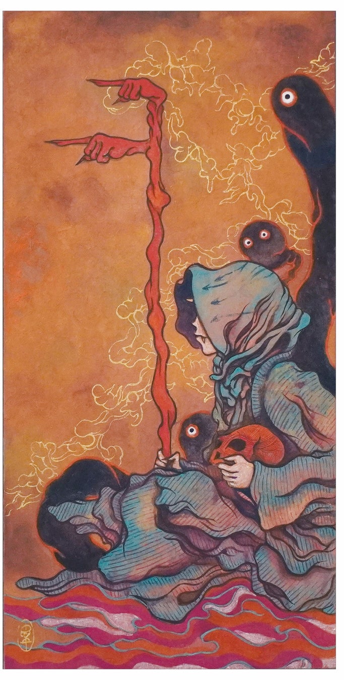 「妖怪に会いたい、友達になりたい」と思った子供の頃から私の画業は始まっていたのかも知れません。会いたさ故に描きだしたというのがそもそもの始まりなのです。妖怪画家、或いは絵描鬼として活動を始めて17年が経ったいま妖怪たちに出会えたかというと正直わかりません。しかし確実に気配を感じているのです。描いている私の後ろから覗き込んでいたり、歩いている横をチョロチョロと付いてきてたり。”みちしるべぇ”という相棒が生まれてからその感覚はさらに強いものへとなりました。そして数年前、世の中に新たな厄災がはびこり始めて会いたい人の会えない、行きたい場所にいけない、やりたいことができない、となった時、アマビエやアマビコをはじめとする疫病関係の妖怪たちがクローズアップされたり、”みちしるべぇ”やその子供である”ちびしるべぇ”たちがいろんな媒体で取り上げられたり、一緒に写真を撮ってくれる人も増え、少しずつですが妖怪たちが人と人人とモノ人と場所などの「縁」をつないでくれてると思ったのです。私はこの妖怪たちがつないでくれた縁のことを『妖縁』(ようえん)と呼ぶことにしました。私の頭の中には『妖怪製造装置』というものがあります。その装置がぐるぐる回りだすと様々な妖怪たちが生まれてきます。私自身が全身一本の筆となりこの現世に生まれた妖怪たちを召喚しているのです。おそらくその装置は会いたいと願った子供の頃には頭の中に存在していたのだと思っています。今回はその妖怪製造装置で生み出された「みちしるべぇ」を中心とした作品群を皆様に見ていただきたいと思っています。私が描く妖怪たちの世界をワクワク楽しんでいただけたら幸いです。