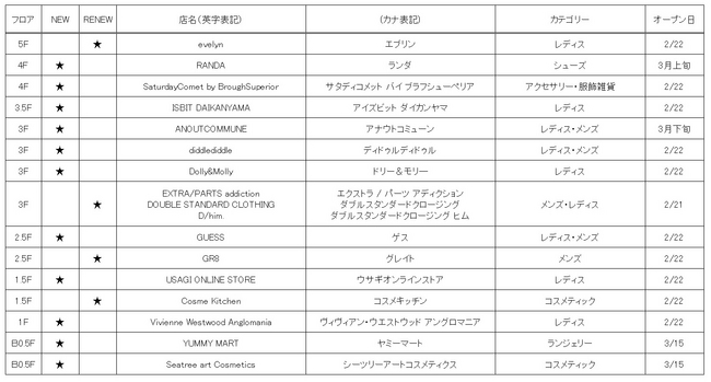 改装区画 計15区画(新店 : 11区画 リニューアル店 : 4区画)