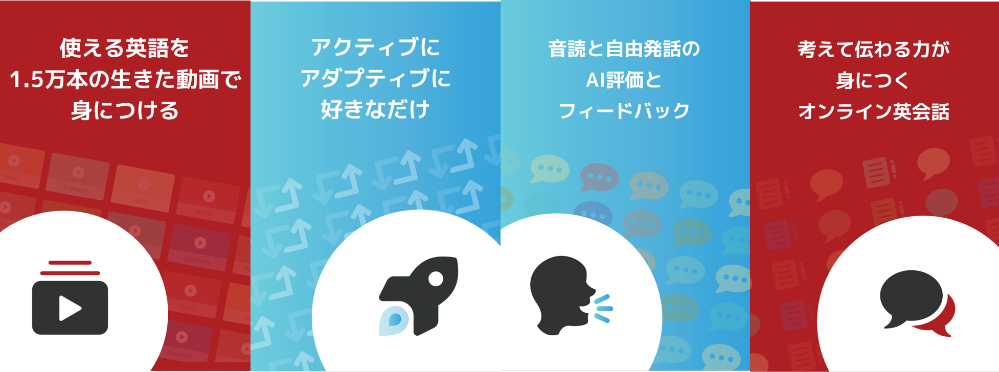 『EnglishCentral』は、1万5000本を超える動画コンテンツと、AIなどの最先端のテクノロジーで個別最適化された自己学習と、質の高い講師陣によるマンツーマンレッスン、のすべてを統合した英語4技能の学習サービスで、2009年にGoogle Ventures社等から出資を受けて設立されました。世界でも類を見ない日本人英語学習者の音声ビッグデータを活用し、即時のフィードバックを受けながら楽しくたくさんの音読と自由発話を練習し、英単語や表現などを使用されている場面の中で繰り返し学び、それを生身の講師と会話しながら運用するところまでをワンストップで提供します。全世界700万人が利用するグローバルなサービスで、国内でも200を超える大学での導入経験を活かして中高や企業にも導入が進んでいます。大田区教育委員会をはじめとした地方自治体の大規模導入や学校・企業単位での導入のほか、桐原書店や三省堂など高校中学の教科書連携コンテンツや航空業界などへの特化型コンテンツ、Classi・まなびポケット等のLMSや企業研修の募集・評価などの外部システム連携にも対応しています。