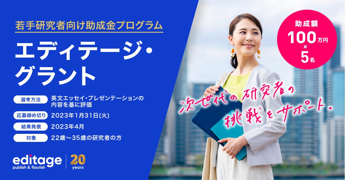 応募者は、2023年1月31日までに応募書類を提出する必要があります。最終選考に残った20名のうち、5名に現金100万円を、15名に10万円のクーポンが贈られます。このクーポンはエディテージのサービスで利用することができます。エディテージ助成金プログラムおよび助成金応募申請に関する詳細は、https://bit.ly/editage_grantをご参照ください。