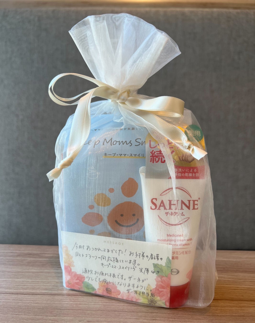 キャンペーンに当選され、スマイル号にご乗車いただいた方にはザーネクリームや、エーザイとキープ・ママ・スマイリングのスタッフによる手書きコメントを添えたメッセージカード等を詰め合わせたプレゼントをお渡しいたしました。