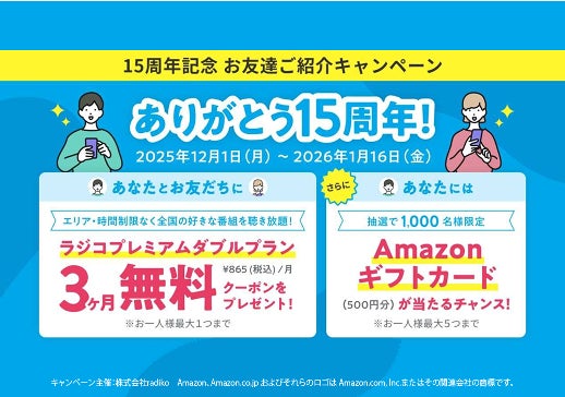 友だち紹介キャンペーンをスタートします。既存ユーザーがアプリ内のリンク『友達紹介はこちら』から特典コード発行URLを取得し、友人にURLをシェア。紹介した友人がradikoアプリにログインして合計3時間以上番組を聴取すると、紹介者と友人双方にラジコプレミアム(ダブルプラン)クーポン3か月分をプレゼント。さらに紹介者には抽選で1000名様にAmazonギフトカード500円分※2)をプレゼントします。