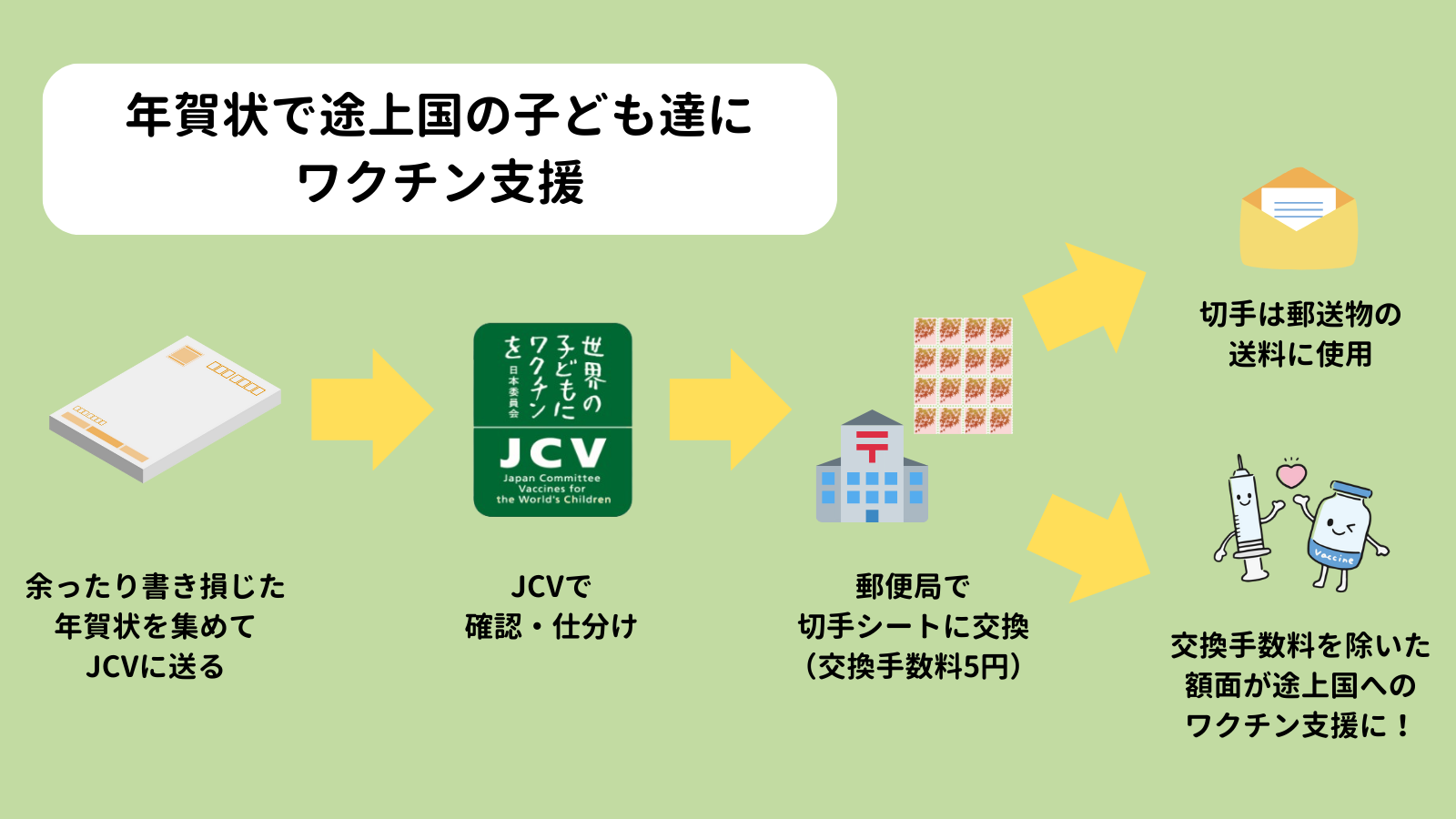 皆さんから贈られた年賀状は、JCVに届くと郵便局で切手シートに交換されます。63円の年賀状の場合、交換手数料5円を除いた58円が寄付となります。交換された切手は、JCVから皆さまへ発送するパンフレット等の資料、受領書、お礼状などの送料として使用します。そして、通信運搬費を節約できた分を、ワクチン支援に活用させていただきます。