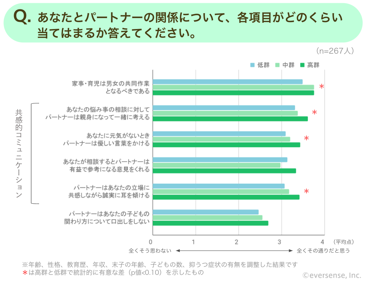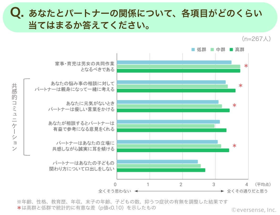「あなたとパートナーの関係について、各項目がどのくらい当てはまるか答えてください」という質問に対し、内発的動機が高い群と低い群の間で有意な差が確認できたのは、「性役割への考え方が平等」、「夫婦間で共感的コミュニケーションが取れている」、「結婚生活への満足度が高い」、という3つの要素です。総じて夫婦関係や夫婦間のコミュニケーションが、父親の内発的動機に関連する可能性が高いことがうかがえました。