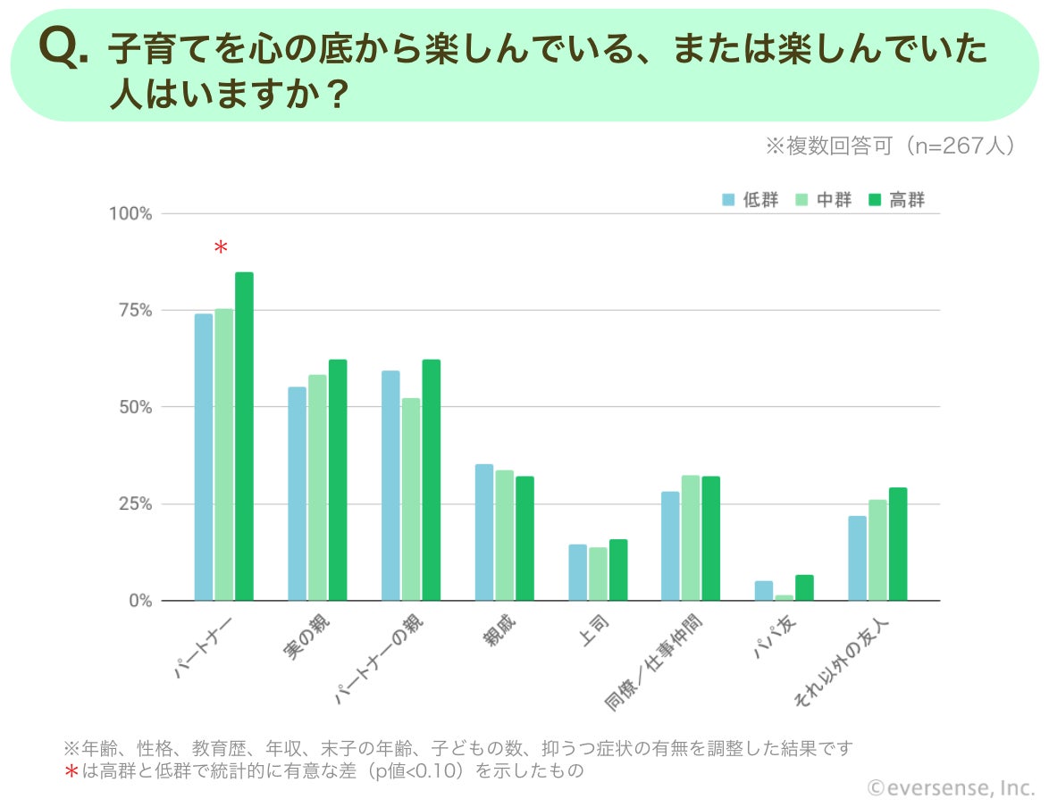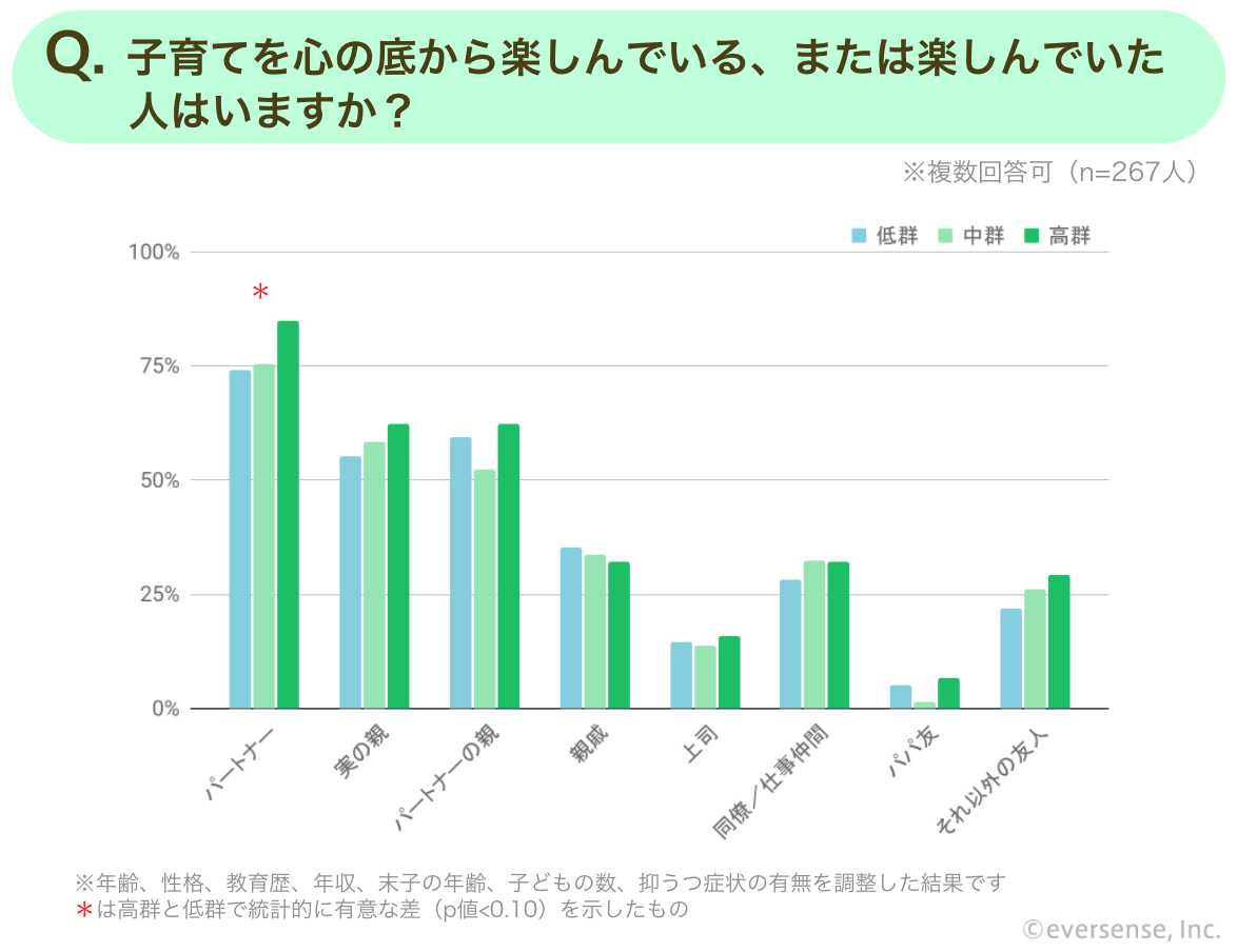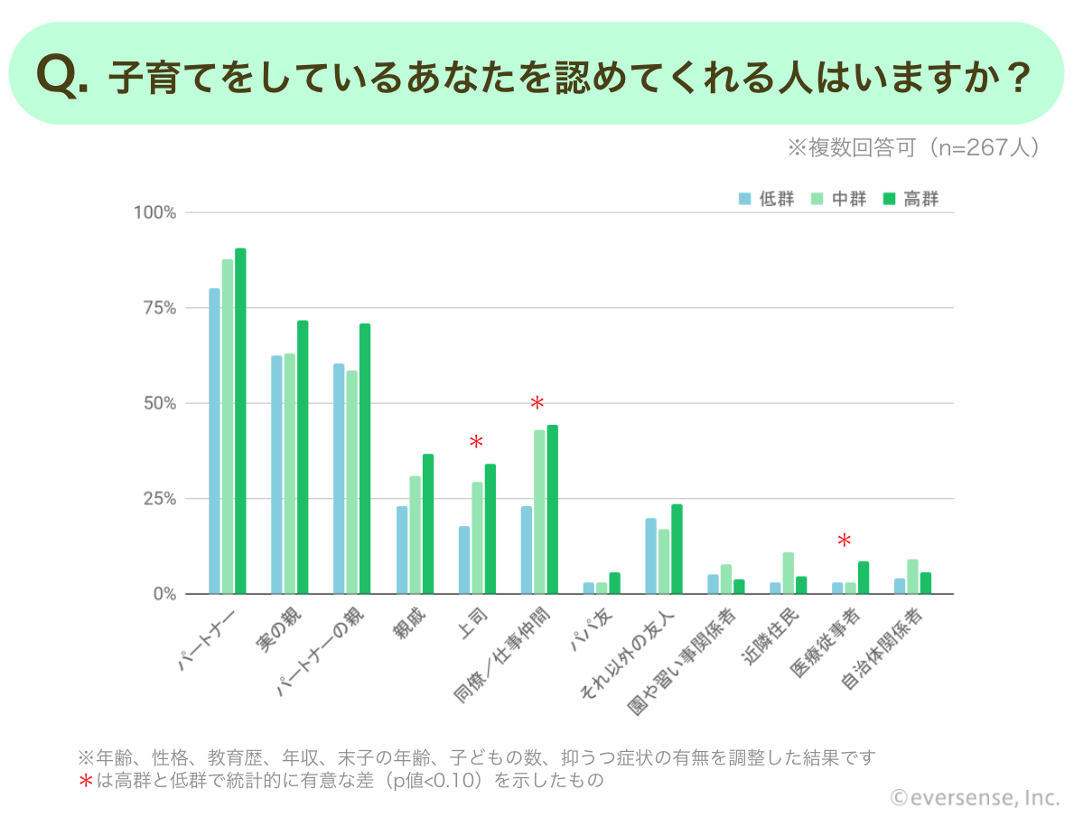 「子育てを心の底から楽しんでいる、または楽しんでいた人はいますか?」という質問に対し、内発的動機が高い群ほど、「パートナー」と回答した人の割合が高く示されました。また、「子育てをしているあなたを認めてくれる人はいますか?」という質問に対し、育児に対してより内発的動機が高い群は、子育てをする自分を認めてくれる「上司」「同僚/仕事仲間」「医療従事者」がいると回答した割合が高くなりました。