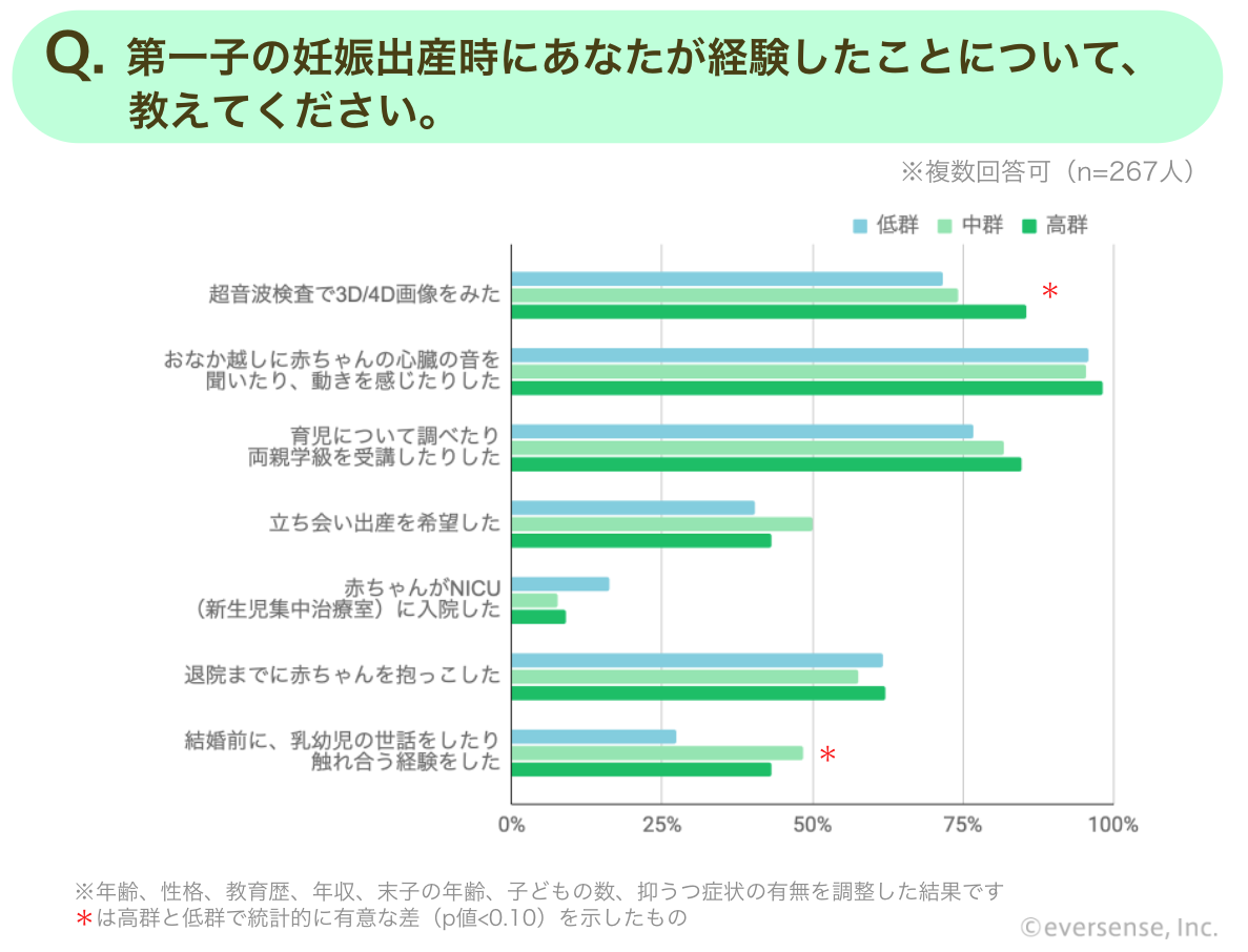 「第一子の妊娠出産時にあなたが経験したことについて教えてください」という質問に対し、内発的動機が高い群と低い群の間で有意な差が確認できた回答は、「超音波検査で3D/4D画像を見た」「結婚前に、乳幼児の世話をしたり触れ合う経験をした」の2つ。