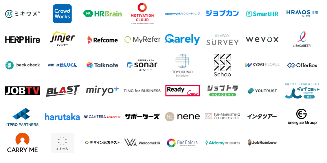 iCARE、アイデミー、i-plug、アトラエ、HRクラウド、HRBrain、ENERGIZE、オープンワーク、AllPersonal、学生就業支援センター、クラウドワークス、サイダス、サポーターズ、JobRainbow、jinjer、Schoo、SmartHR、ZENKIGEN、Thinkings、Talknote、DONUTS、ととのえ、トヨクモ、nene、HERP、Hajimari、Piece to Peace、ビズリーチ、FiNC Technologies、VISITS Technologies、フロンティア、ベクトル、MyRefer、未知、YOUTRUST、ラフール、リアステージ、リアライブ、リーディングマーク、リード・イノベーション、リブ、リフカム、リンクアンドモチベーション、Legaseed、ROXX、ワークスタイルテック、OneColors