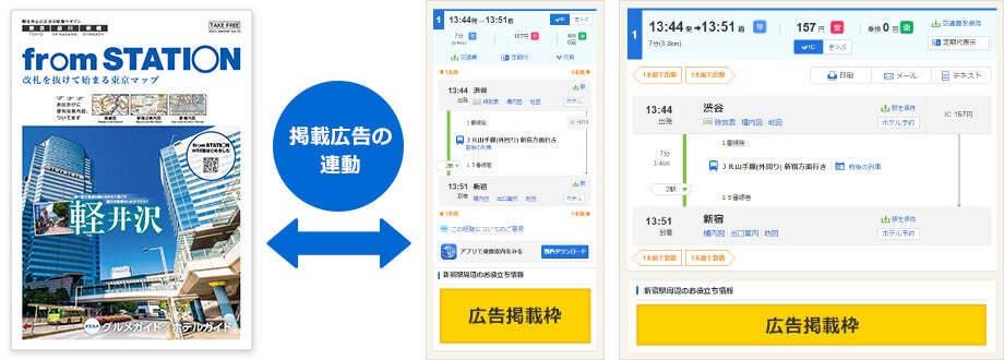 株式会社駅探(本社:東京都千代田区、代表取締役社長:金田直之、以下「当社」)は、従来から業務提携を締結しております表示灯株式会社(本社:愛知県名古屋市 代表取締役社長:德毛孝裕、以下「表示灯」)との連携を増強し、表示灯が企画・制作するJR東日本の主要6駅の情報紙「from STATION」の大幅リニューアルに伴い、紙媒体の情報紙とインターネット媒体である乗り換え案内・経路検索結果のWEBページと連動を強化させた広告メニューの展開も開始いたします。