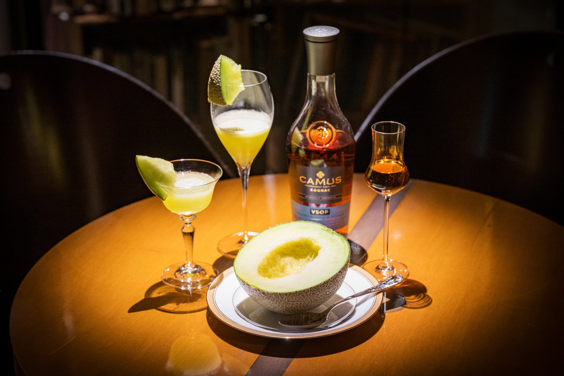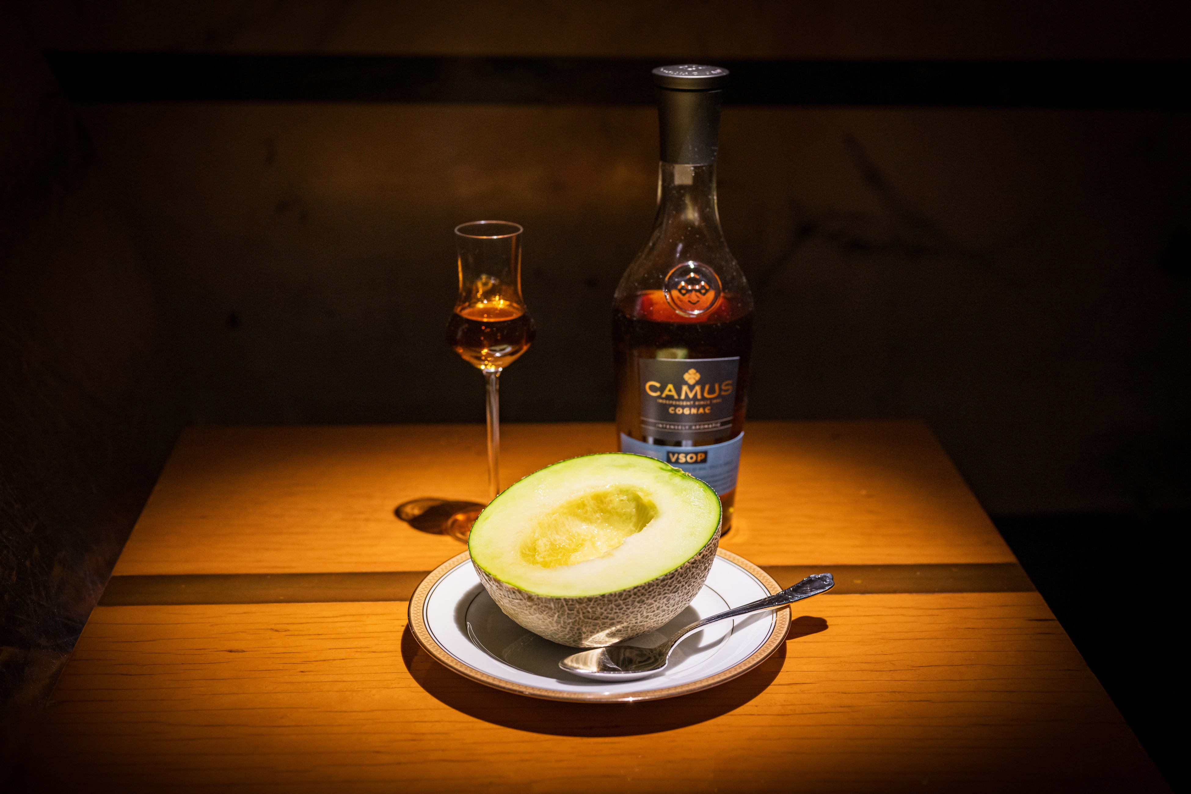 ハーフカットしたイバラキングメロンに、贅沢にコニャックを注ぎます。