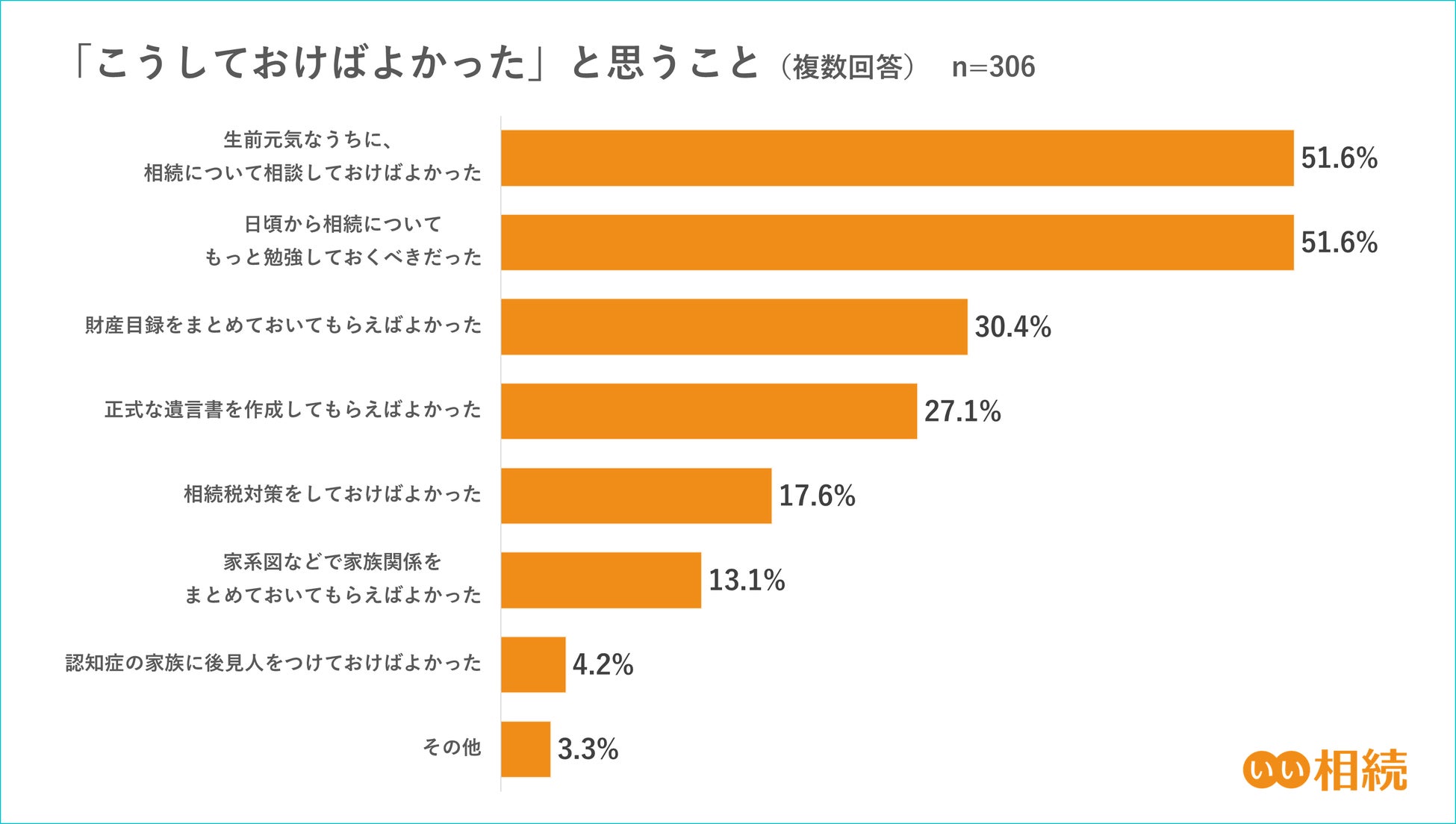 「こうしておけばよかったこと」についての質問では「日頃から相続についてもっと勉強しておくべきだった」、「生前元気なうちに、相続について相談しておけばよかった」が51.6%で同率1位でした。またその他の中には「WEBサービスや各種パスワードをまとめておいてほしかった」という回答もみられデジタル遺品の取り扱いに関して悩まれた方もいました。