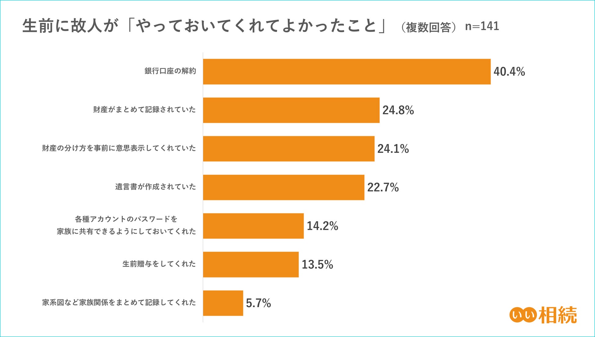 生前に故人が「やっておいてくれてよかったこと」について質問で、回答の1位が「銀行口座の解約」の40.4%でした。相続の手続きにおける銀行口座の解約では被相続人の出生から死亡までの連続した戸籍謄本や相続人全員の印鑑証明書などの書類が必要になるため、生前に本人が解約するよりも手間がかかります。