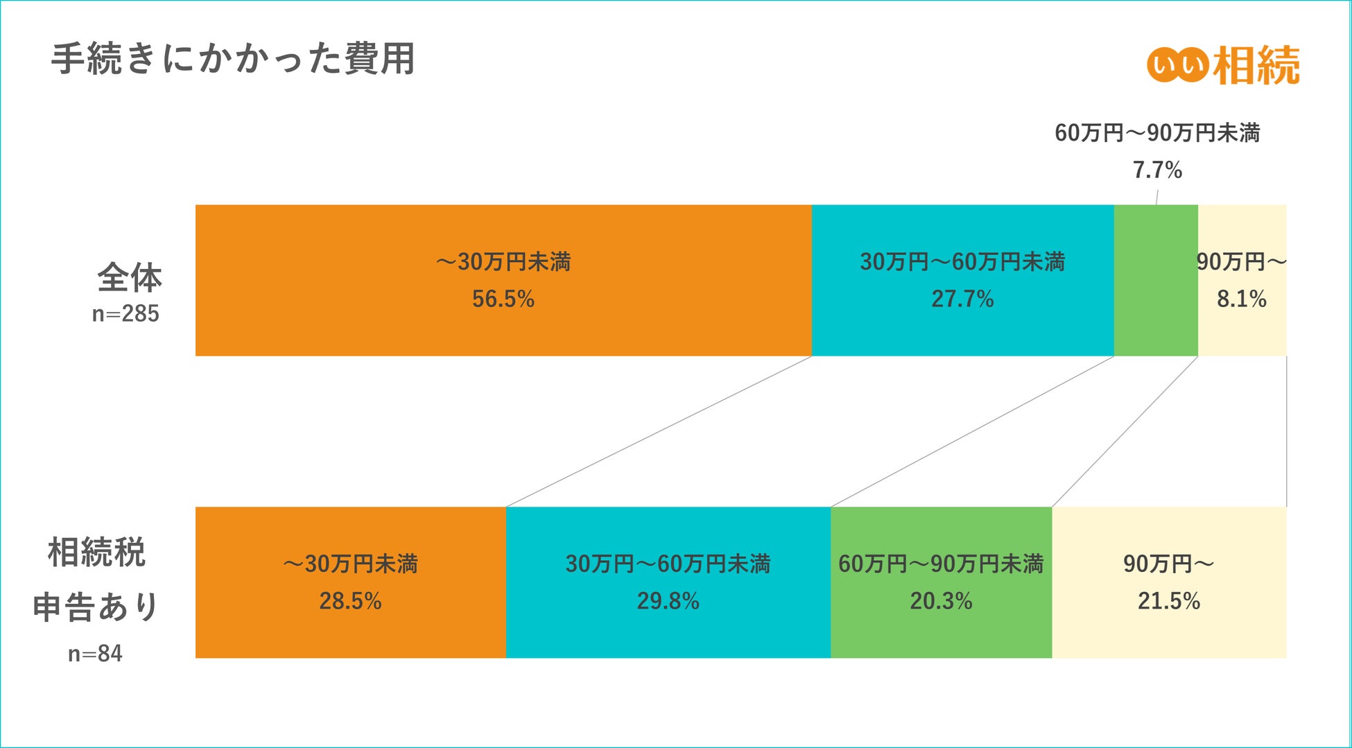 また、手続きにかかった費用についての質問では56.5%の方が「30万円未満」と回答しています。一方で「相続税申告あり」と回答した方の中でみると、「30万円未満」と回答した方は28.5%で「90万円以上」と回答した方が21.5%でした。