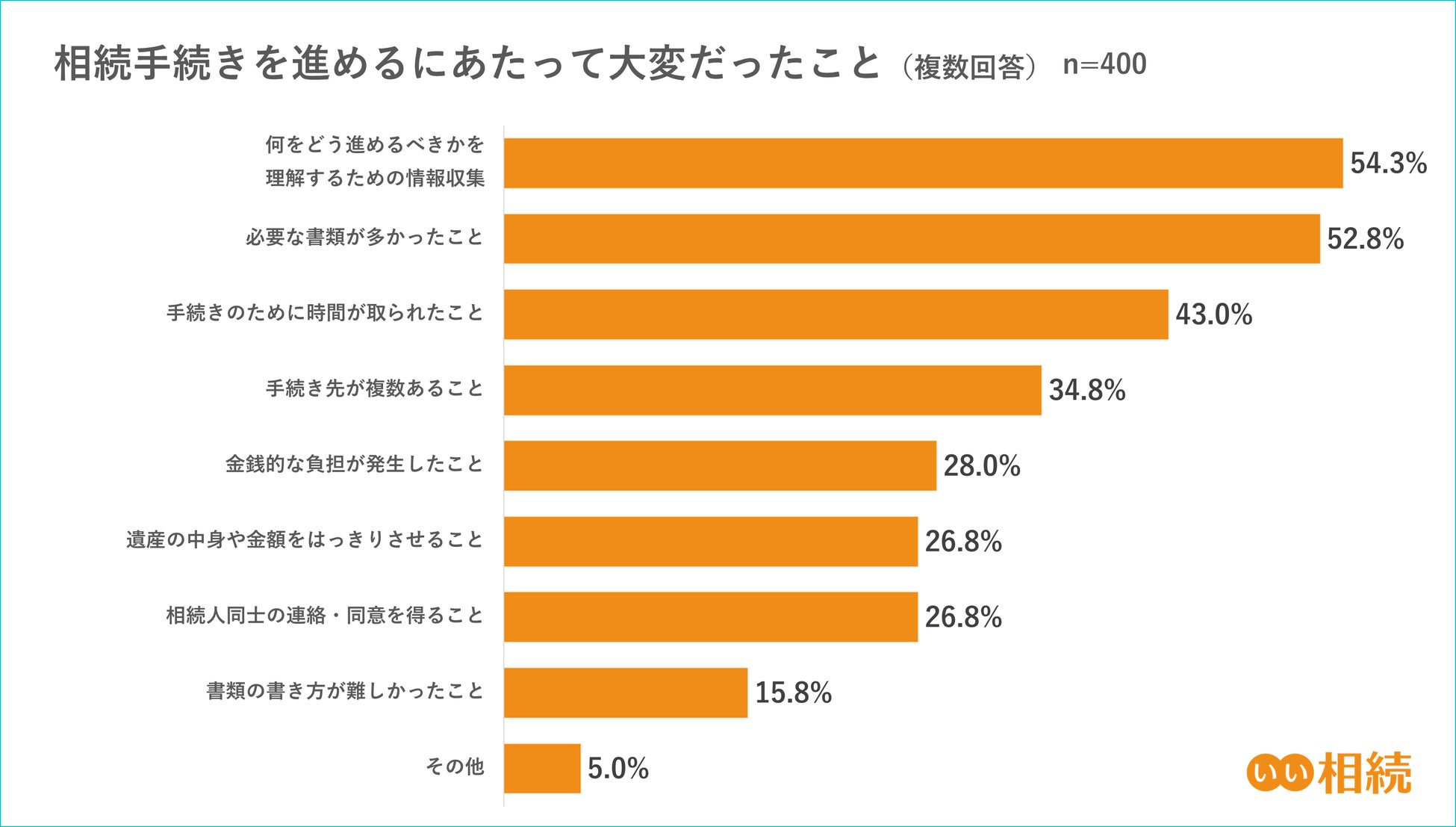 さらに相続手続きを進めるにあたって大変だったことについての質問では「何をどう進めるべきかを理解するための情報収集」が54.3%で1位、「必要な書類が多かったこと」が52.8%で2位、「手続きのために時間が取られたこと」が43.0%で3位となっており、「金銭的な負担が発生したこと」の28.0%を大幅に上回りました。このことから「費用」よりも「労力」がかかることが大変だったという回答が多いことがわかる結果となりました。