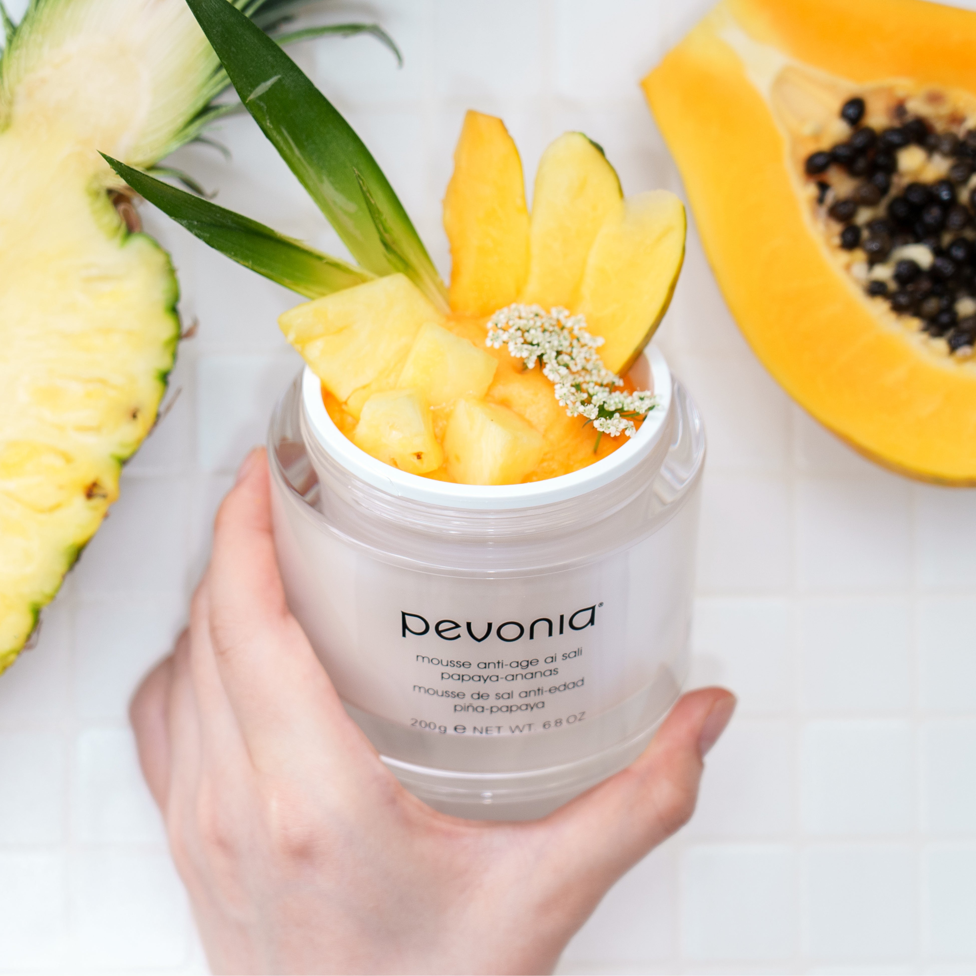 「ディエイジング ソルトムース パパイヤパイナップル」は、魅惑的な南国の香りが特徴の、シーソルトをベースにしたボディスクラブ。
