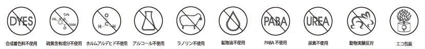 合成着色料、合成香料、鉱物油、パラベン、尿素、ホルムアルデヒド、アルコール、ラノリンフリー。