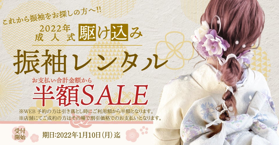 内容 :2022年成人式に参加される新成人の方が開催期間内に店頭・宅配にて振袖レンタルをご予約でお支払額から半額となります。