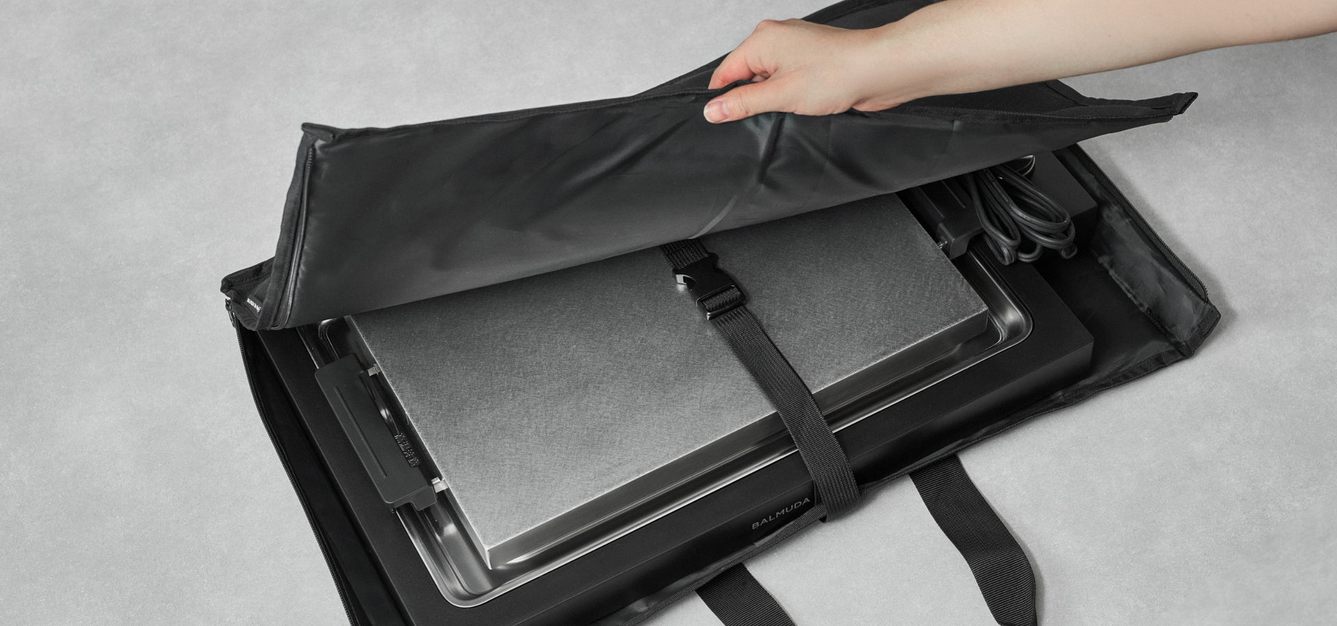 本日2024年10月11日(金)から数量限定で、BALMUDA The Plate Proをご購入の方に、本体と付属のヘラ一式をまとめることができる専用ケースをプレゼントいたします。内側のベルトでしっかりと固定されて縦向きで保管することができるので、コンパクトに収納が可能です。ぜひこの機会にご利用ください。