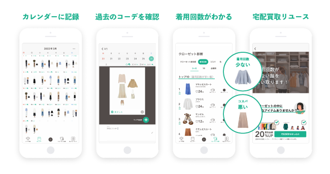さらに、1着あたりの着用回数を計測できるため、着ている服・着ていない服を可視化、1着あたりのコスパを算出することができ、手持ち服の活躍状況を振り返る際にもご活用いただいております。着ていない服に対しては、AIスタイリストがその他の手持ち服と組み合わせたコーディネートを提案することで有効活用を促します。着ていない服や手放したいアイテムがある場合は、トレジャー・ファクトリー社と連携した「宅配買取」よりリユースに出すことができます。手持ち服の活用からリユースまでをサポートすることで、サステナブルな循環型ファッション体験を提供しています。