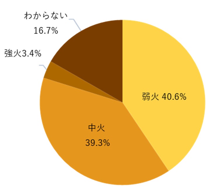 おでんを調理する際の火加減について聞いたところ、「弱火」と答えた方が40.6%、「中火」と答えた方が39.3%とほぼ同等で、全体の約8割を占めました。「強火」は3.4%でした。