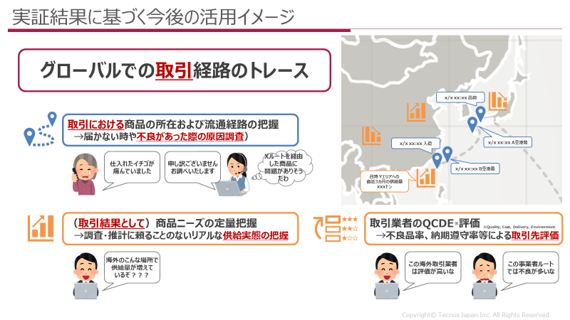 今回の検証結果は、企業間取引の商流情報と物流情報に基づいた安心安全な水産物、農産品の輸出及び、ブロックチェーン技術を絡めた契約・取引を起点とする在庫トレースの実現性に向けて、一定の成果につながったと認識しております。