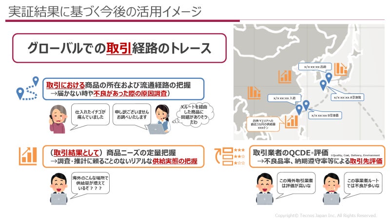 今回の検証結果を踏まえ、テクノスジャパンおよびChaintopeは、引き続き実用化に向けた深掘りを進めます。トレーサビリティ情報の自動取得や、各種IoTセンサーを活用したデータ補完など、グローバルサプライチェーンにおけるトレーサビリティの実現性の追求を目指し、サプライチェーン上の業務効率化と持続可能な開発目標の達成に寄与する新しい価値の提供を実現するため、今後も連携してバリューチェーン全体を見据えたサービス展開を進めて参ります。