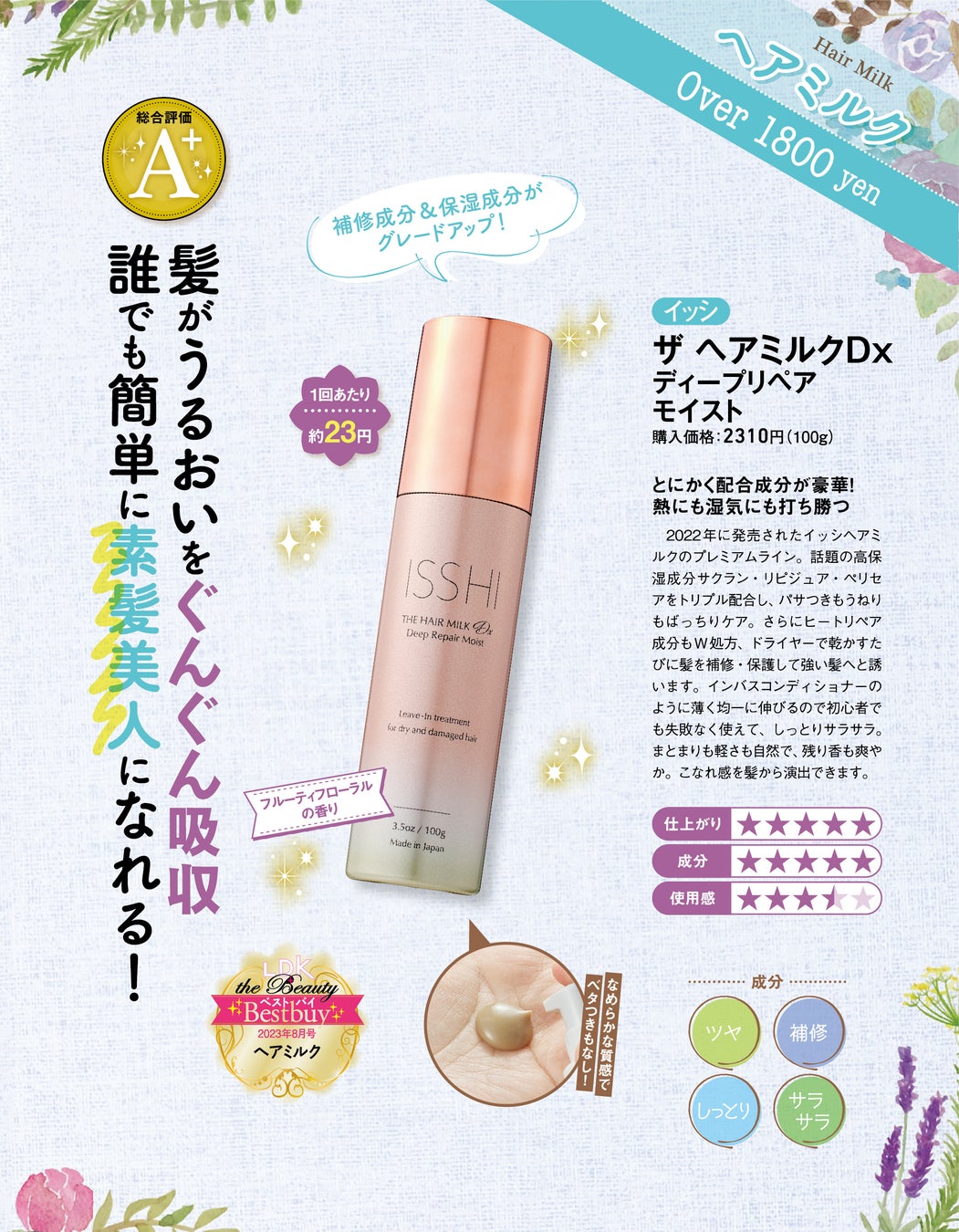 ※2023年8月号『LDK the Beauty ヘアミルク部門』でBestbuy&第1位を獲得※1スイゼンジノリ多糖体。「サクラン®」はグリーンサイエンス・マテリアル株式会社の登録商標 ※2ポリクオタニウムー64及びポリクオタニウムー61。リピジュア®は日油株式会社の登録商標 ※3ジラウロイルグルタミン酸リシンNa。ペリセア®は旭化成ファインケム株式会社の登録商標 ※4ヘアコンディショニング成分※5ステアルジモニウムヒドロキシプロピル加水分解ケラチン(羊毛) ※6 γ-ドコサラクトン、メドウフォーム-δ-ラクトン ※7イッシヘアパックセラム対比 ※8 ポリクオタ二ウム-64及びポリクオタ二ウム-61、ヒアルロン酸Na、加水分解コラーゲン、乳酸Na、スクワラン、セラミド(セラミドAP/セラミドNP/セラミドNG)、ラウロイルグルタミン酸ジ(フィトステリル/オクチルドデシル) ※9髪の指通り、ツヤ、まとまり等の質感が変化すること