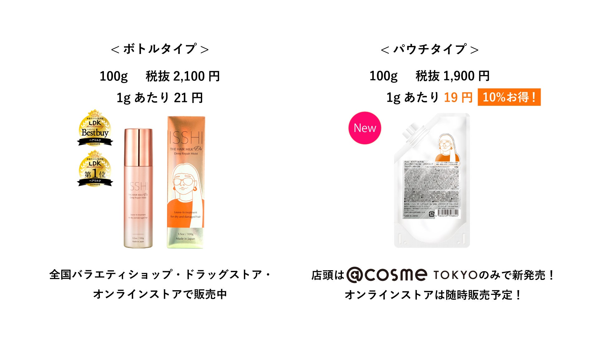 株式会社ジャパンゲートウェイ(所在地:東京都港区 代表:伊藤英信)が展開する、くせ・うねり、広がり、パサつき等のお悩みに向けたヘアケアブランドISSHI(イッシ)は、@cosme TOKYOでの特別展開を記念しまして『ザ ヘアミルクDxディープリペアモイスト』のパウチタイプを販売します。