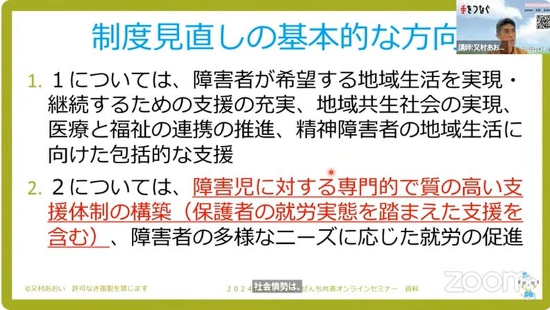 又村氏より、令和6年4月の障害福祉サービス等の制度見直しの基本的な方向をご説明いただきました。