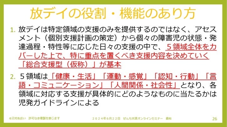 今後求められる役割として、5領域(「健康・生活」「運動・感覚」「認知・行動」「言語・コミュニケーション」「人間関係・社会性」)全体をカバーしたうえで、特に重点を置くべき支援内容が整理されていることであると明示いただきました。