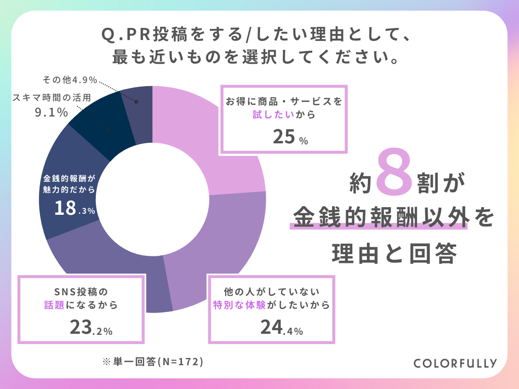 個別回答では「良い商品を作っている企業を応援したい」「自身のフォロワーに対し良いものを紹介したい」という声もあり、全体の約8割が金銭的報酬以外を理由にPR投稿をしたいと考えていることがわかりました。
