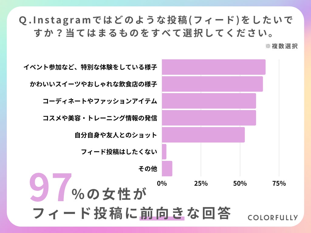 また、具体的な投稿内容については「自分自身や友人とのショット」(53%)に対し、「イベント参加など、特別な体験をしている様子」(66.3%)、「かわいいスイーツやおしゃれな飲食店の様子」(64.6%)と、「人物」にフォーカスした投稿より「体験」について発信したいユーザーが10ポイント以上多い結果となりました。