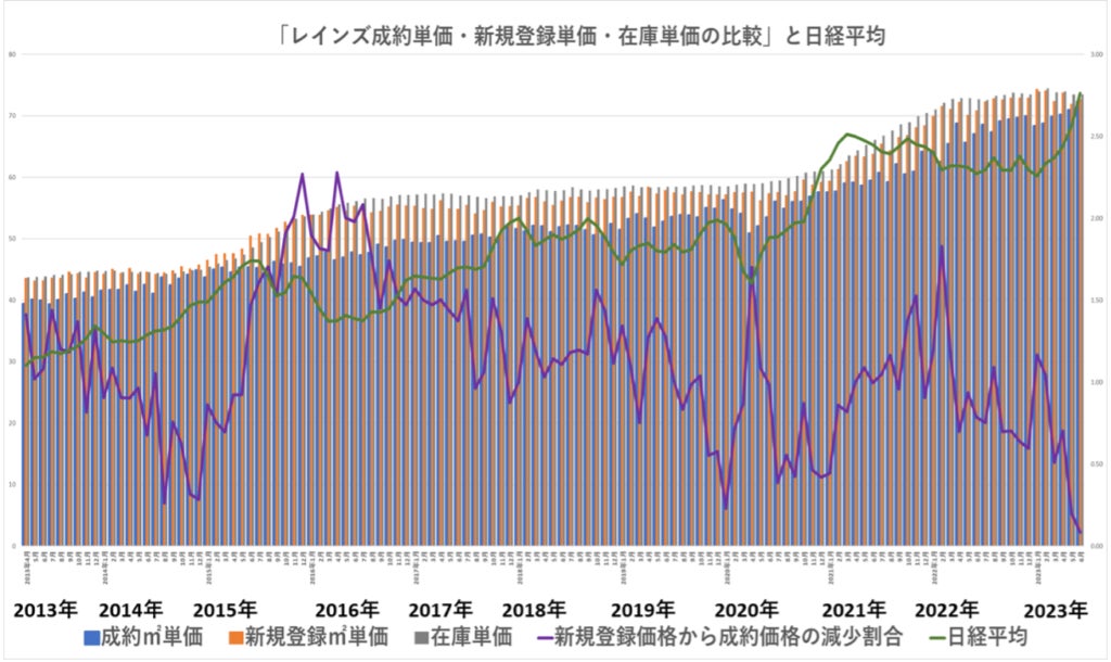 一方、日経平均株価と新規登録価格から成約価格の減少割合はほぼ反比例の動きをしています。このまま日経平均株価が上昇トレンドを描き続けるとすれば、新規価格と成約価格の差はさらに狭まり、限りなくゼロに近くなるものと考えられます。