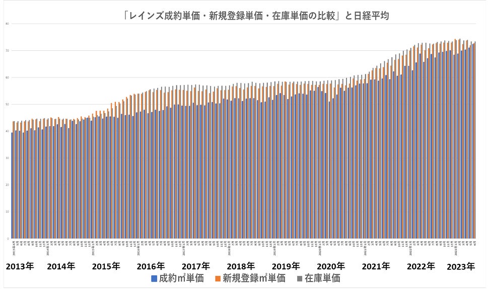 上記のグラフは首都圏(一都三県)青の棒線が平均成約平米単価、オレンジの棒線が平均新規売出平米単価を表しています。