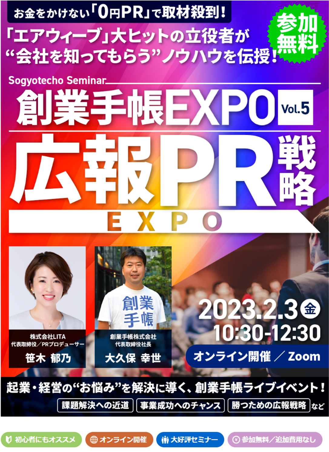 創業手帳株式会社(本社:東京都中央区京橋、代表:大久保幸世)は、このたび2023年2月3日(金)に「広報PR戦略EXPO」を開催します。