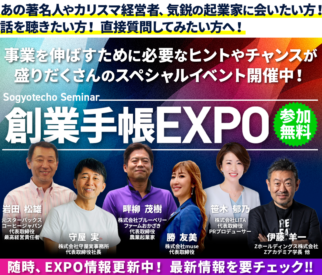 そんなお悩みをお持ちの経営者・起業家・事業者さまにうってつけのイベントが今回の創業手帳EXPOです。
