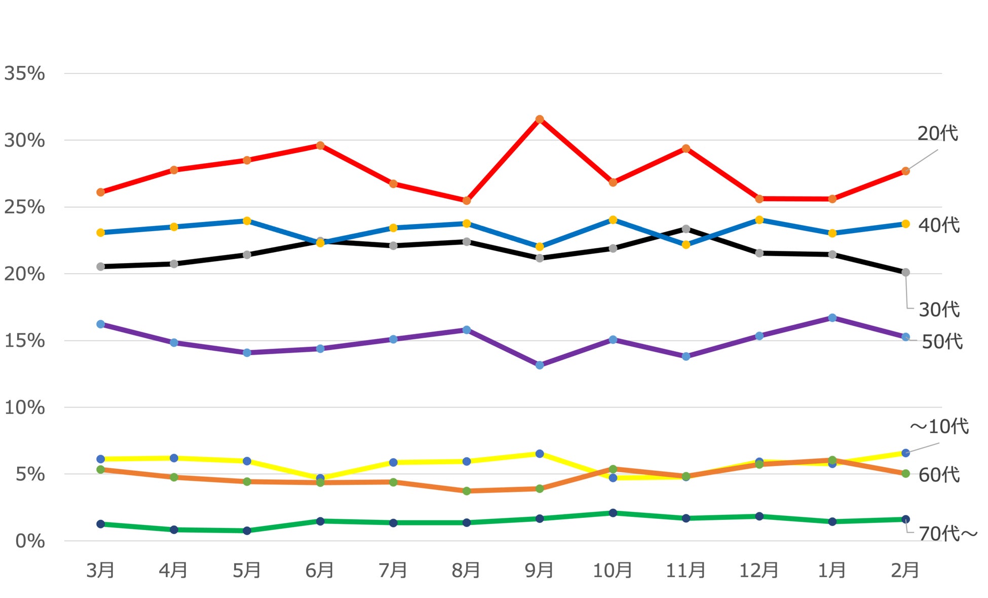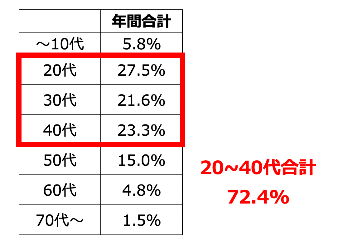 ◆ 修理依頼件数で最も多いのは20代。また、20~40代で全体の70%以上を占める。