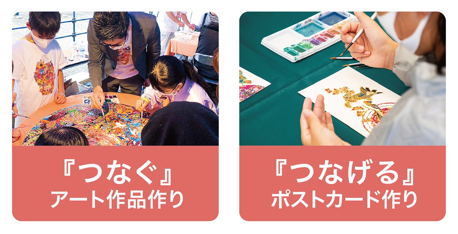 <アートワークショップ> 「繋がり」をテーマにした画家 鎌谷徹太郎さんによるワークショップ。大分で描いた作品を11月の東京会場につなげ完成させます。