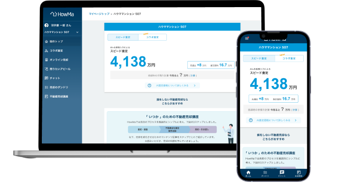 HowMaに無料会員登録した不動産オーナーが利用できるページです。日本全国の住居用不動産(マンション・戸建)の売却を検討している不動産オーナーが物件名・物件住所を入力することにより、AIが計算した推定売却価格をマイページ上で確認いただくことが可能です。時期による価格変動や周辺相場・周辺取引状況もトータルで確認することができます。