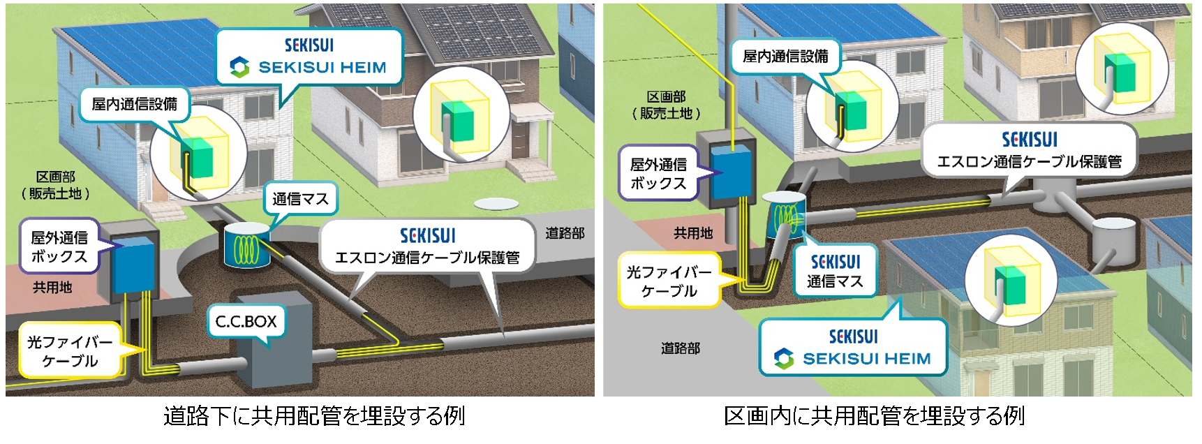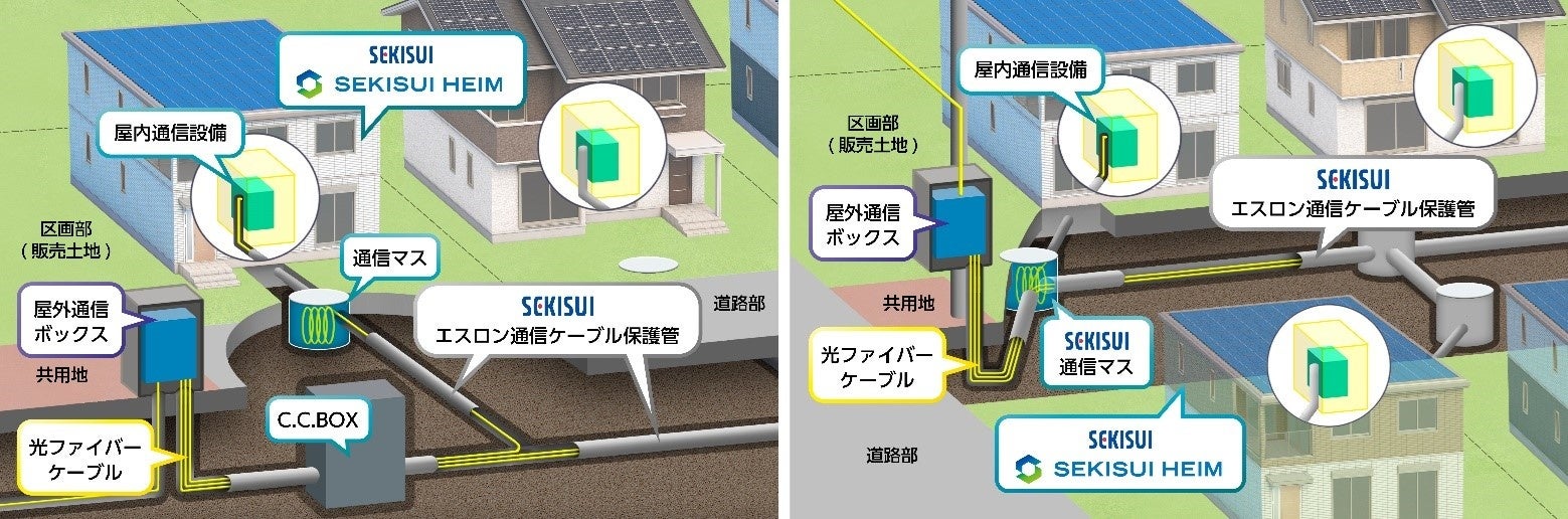 また、リードタウンの共用地には専用の屋外通信ボックスを設置。屋外通信ボックスから各住戸まで光ファイバーケーブルを通す管路には、積水化学グループの製品である「エスロン通信ケーブル保護管」等を利用し地中に埋設することで、災害に強く安全性・信頼性の高い、レジリエンスな通信インフラを実現します。