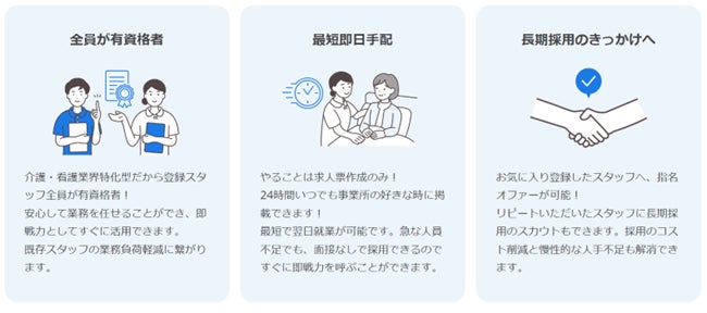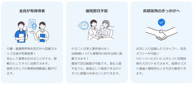さらに求人票制作のみで24時間いつでも求人掲載ができ、面接なしで採用できるため最短翌日就業が可能となるので、急な人員不足が発生した際にも対応できます。また、指名オファーやリピートいただいたスタッフへの長期採用のスカウトも可能で、採用コストの軽減と慢性的な人手不足の解消に繋がります。