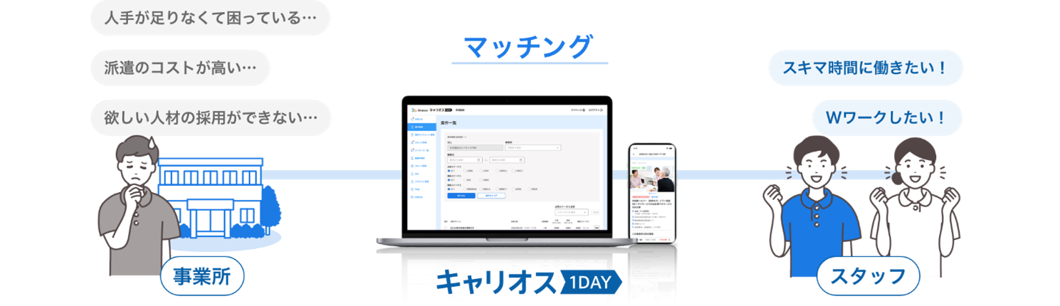 すぐに人手が欲しい事業所と、介護・看護の有資格者をマッチングするため、急な人員不足や慢性的な介護職・看護職の人手不足も解決に導く、介護・看護業界特化型スポット・単発バイトのマッチングサービスです。